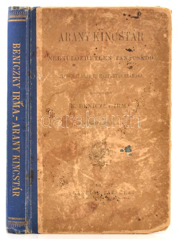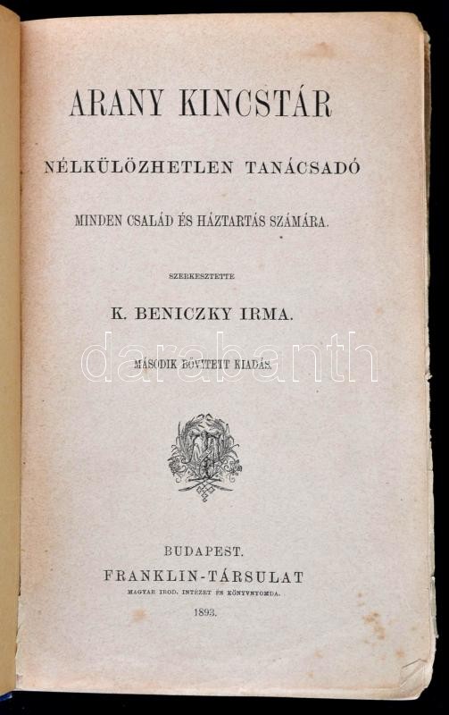 Aranykincstár. Nélkülözhetetlen tanácsadó minden család és háztartás számára. Szerk.: K. Beniczky Irma. Bp.,1893, Franklin. Második kiadás. Kiadói félvászon-kötés, kopott, foltos borítóval, foltos hátsó szennylappal.