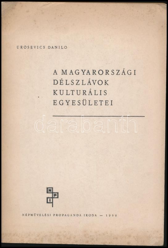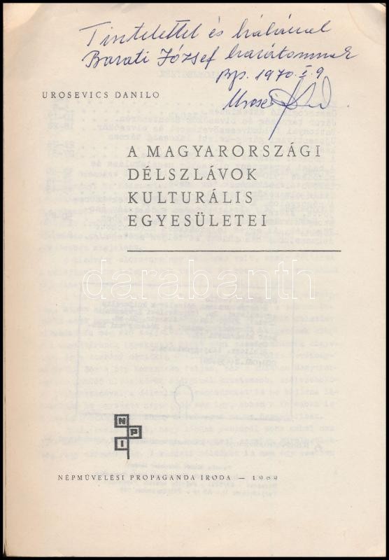 Urosevics Danilo: A magyarországi szlávok kulturális egyesületei. Könyvtártudományi és Módszertani Központ kiadványai 32. Bp.,1969, Népművelési Propaganda Iroda. Kiadói papírkötés, borító kissé foltos, a gerincen kis sérüléssel. Megjelent 700 példányban. A szerző által dedikált.
