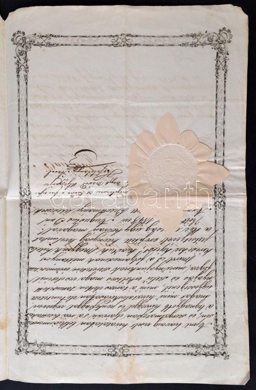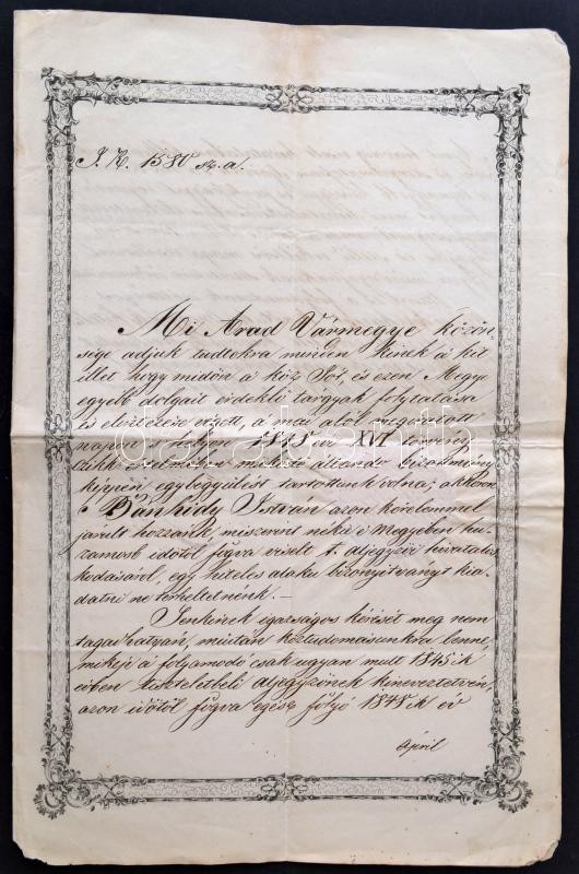 1848 Arad, Igazolás aljegyző részére. Kosztolányi Antal másodjegyző aláírásával, a megye címeres, papírfelzetes viaszpecsétjével / Warrant with the seal of the county