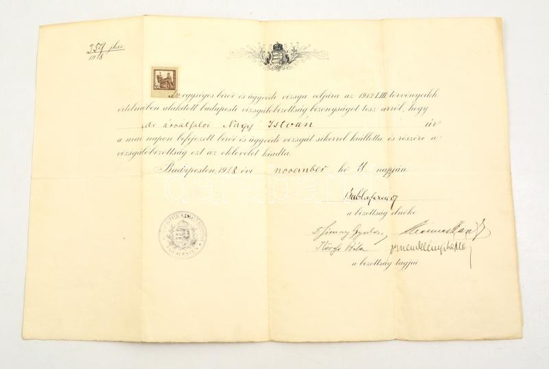 1918 Ügyvédi vizsgabizonyítvány 50x32 cm https://www.darabanth.com/de/332-Fernauktion/332.0/Andere-Sammelgebiete/Dokument~500018/1918-Ugyvedi-vizsgabizonyitvany-50x32-cm~II1856347