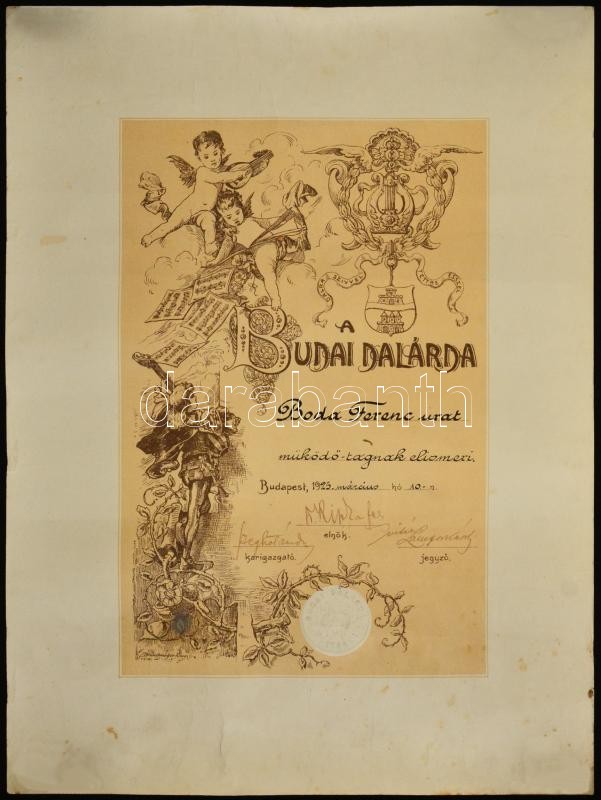 1925 A Budai Dalárda tagsági oklevele Boda Ferenc (1875-?) színész rés... https://www.darabanth.com/de/332-Fernauktion/332.0/Andere-Sammelgebiete/Dokument~500018/1925-A-Budai-Dalarda-tagsagi-oklevele-Boda-Ferenc-1875-szinesz-reszere-29x39-cm~II1857136