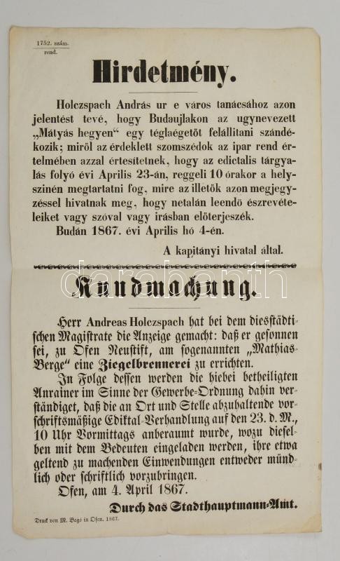 1867 Budaujlak Holzspach téglaégető felállításáról tudósító hirdetmény... https://www.darabanth.com/de/332-Fernauktion/332.0/Andere-Sammelgebiete/Drucksachen~500030/1867-Budaujlak-Holzspach-teglaegeto-felallitasarol-tudosito-hirdetmeny-24x38-cm~II1856442