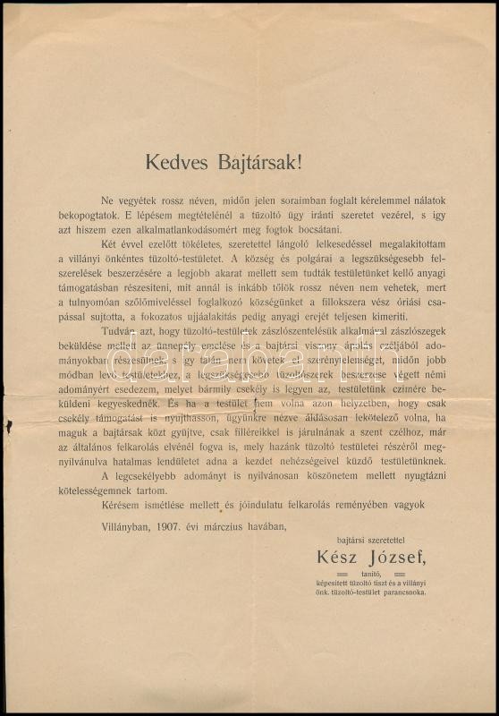 Beschreibung: 197 Villány, A villányi tűzoltóparancsnok adománykérő felhívása tűzoltó-felszerelés fejlesztése miatt