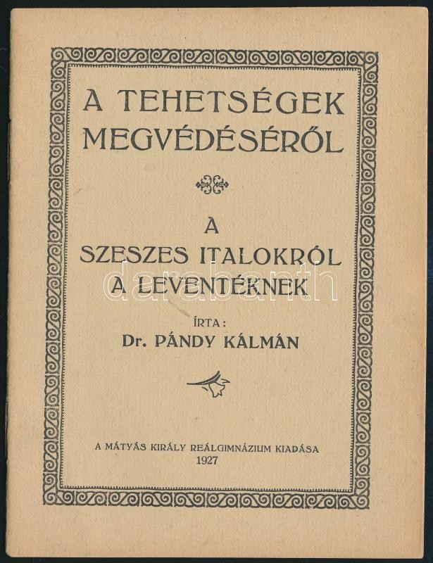 Pándy Kálmán: A tehetségek megvédéséről. A szeszes italokról Leventékn... https://www.darabanth.com/de/332-Fernauktion/332.0/Andere-Sammelgebiete/Drucksachen~500030/Pandy-Kalman-A-tehetsegek-megvedeserol-A-szeszes-italokrol-Leventeknek-Bp-1927-Maty~II1856988