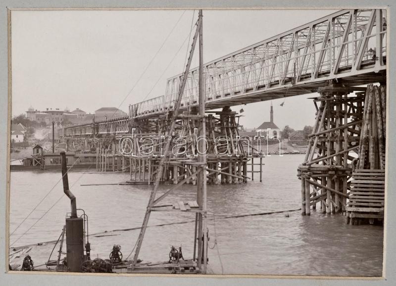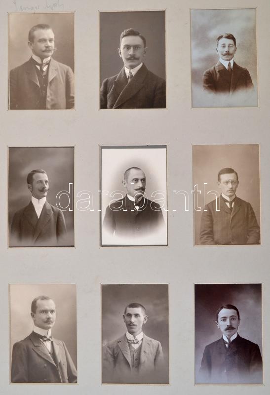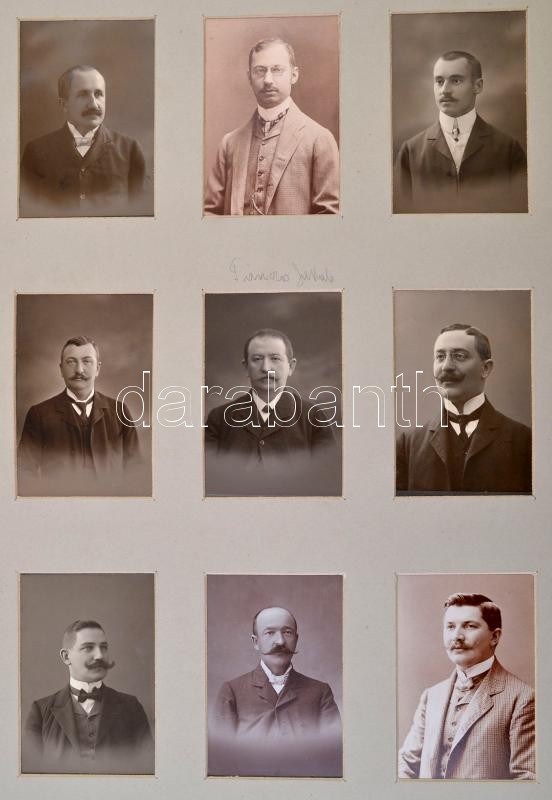 cca 1880-1890 Díszesen aranyozott egészbőr vasúti témájú fotóalbum, egyedi Gottermayer-kötésben, aranyozott táblaélekkel, benne: a szegedi MÁV igazgatóság épületével, Temesvár-Józsefváros pályaudvar épületével, Stájerlakanina vasúti pályaudvar, a vasúti szerelvényeket szállító gombosi gőzkomp, Oravica-Anina viadukt fotóival, további kettő azonosítatlan helyszín fotójával, valamint vasúti tisztviselők fotóival, 70 db keményhátú fotó, néhány feliratozva, összesen 70+8 db keményhátú fotó, különféle méretekben, a fotók jó állapotban, a gerincen kis sérüléssel, a borítón kis kopással, az egyik tábla sérült, foltos elülső kötéstáblával és előzéklappal, az a hátsó táblán a fém rátétek hiányosak, sérültek./ cca 1880-1890 Decorative gilt full leather photo album, about railway topic, Gottermayer-binding, with gilt sheet edges, with 71 pc portraits boardphotos of railway officers, and 8 pc board photos of interesting places (building of MÁV directorate of Szeged, building of railway station of Timisoara (Temesvár/Temeswar), building of railway station of Anina (Stájerlakanina/ Steierdorf), steam ferry with railroad cars in Bogojevo (Gombos), railway viaduct beetween Oravita (Oravica/Orawitza) and Anina (Stájerlakanina/ Steierdorf) and two other photos of unkown places), all: 70+8 pieces of boardphotos, different sizes, the photos in good conditions, with little damage on the spine, with little worn on the cover, one sheet damaged, the front cover and the front smear sheet spotty, the metal applications on the back cover damaged.