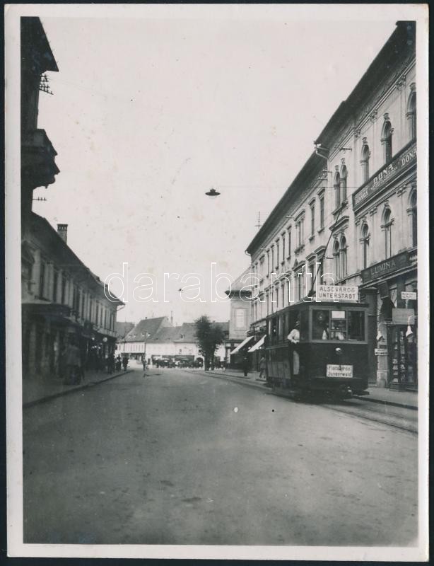 cca 1930 Nagyszeben, Hermannstadt, Sibiu; Alsóváros-Fiatalerdő közt közlekedő villamos, Duna Biztosító épülete, 11,5x9 cm / tram, street, photo, 11,5x9 cm