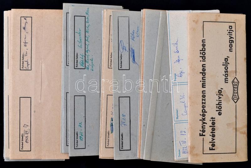 cca 1970 és 1990 között készült, feltáratlan negatív gyűjtemény, a tároló tasakok egy részén feliratok, dátumok, helyszínek, sokféle téma és fotóműfaj, cca 4.000 db vintage negatív, 24x36 mm és 6x6 cm