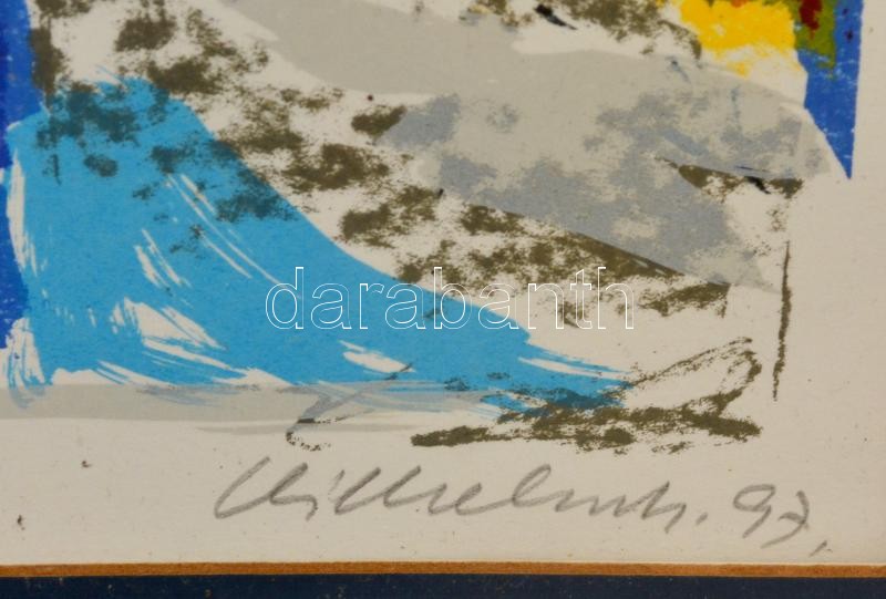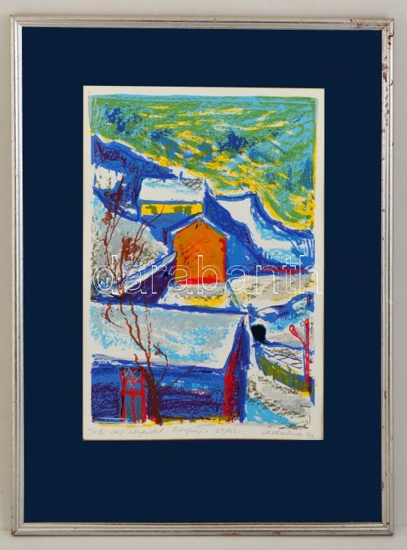Beschreibung: Vilhelm (Wilhelm) Károly (1943-2011): Tél táj. Színes litográfia , papír, jelzett, üvegezett keretben, 47×31 cm