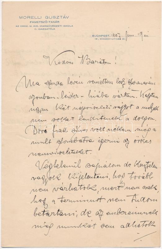 1907 Bp., Morelli Gusztáv (1848-1909) fametsző tanár fejléces levélpap... https://www.darabanth.com/de/332-Fernauktion/332.0/Andere-Sammelgebiete/Historische-Dokumenten-Handschriften~500019/1907-Bp-Morelli-Gusztav-1848-1909-fametszo-tanar-fejleces-levelpapirjara-irt-maganlevel~II1841076