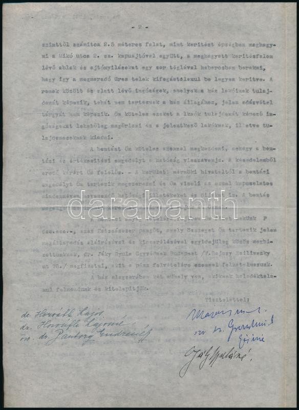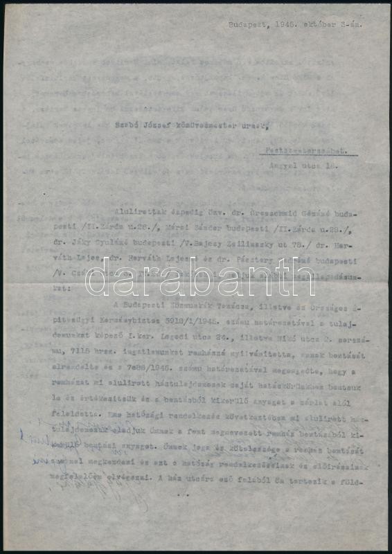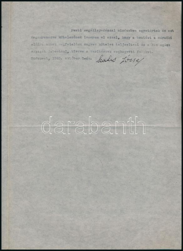 1945 Márai Sándor (1900-1989) író saját kezű aláírása Mikó utcai házának, amely Budapest ostromakor megsérült, mint romháznak, építőanyagként való eladásáról szóló szerződésen. A ház többi volt lakójának aláírásával egyetemben.