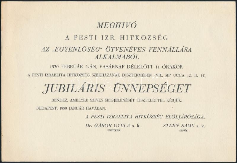 1930 Meghívó a Pesti Izraelita Hitközség által az "Egyenlőség" folyóir... https://www.darabanth.com/de/332-Fernauktion/332.0/Andere-Sammelgebiete/Judaica~500025/1930-Meghivo-a-Pesti-Izraelita-Hitkozseg-altal-az-Egyenloseg-folyoirat-50-eves-evfordulC3~II1856498