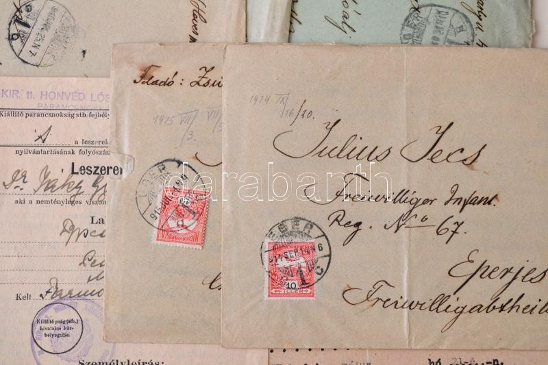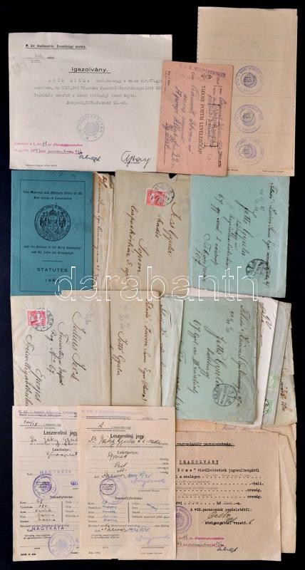 1914-1963 Vegyes papírrégiség tétel, militária témában, tábori levelezés, leszerelési papírok, szabadságolási igazolvány, és két érdemérem viselésére jogosító igazolvány, valamint General Statutes of the Masonic and Military Order of the Red Cross of Constantine and the Orders of The Holy Sepulchre and of St. John the Evangelist (1963)), kb. 20 db.