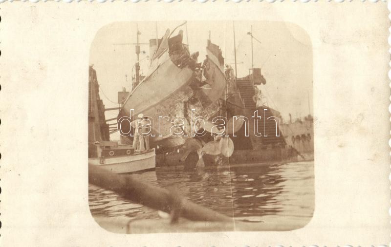 Beschreibung: 1917 SMS Csepel, osztrák-magyar Tátra osztályú romboló roncsai az otrantói-csata után / K.u.K. Kriegsmarine, damaged SMS Csepel after the battle of Otranto, photo