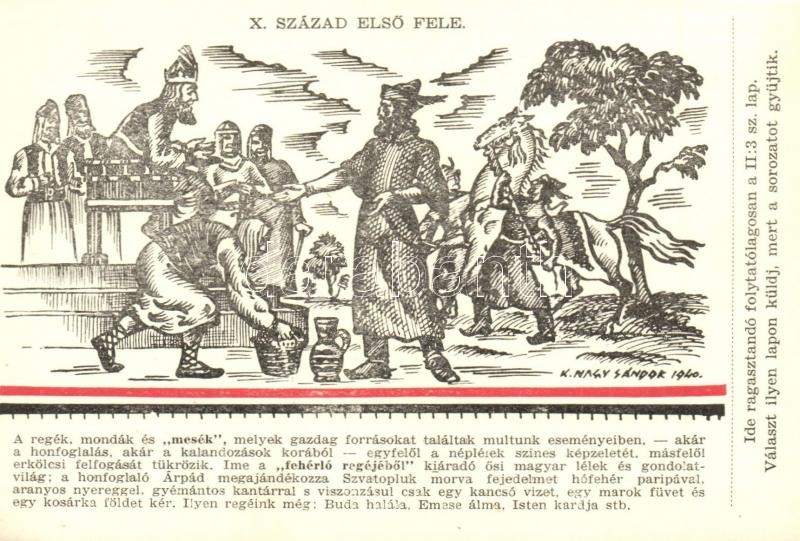 A magyar lélek ezeréves útja; A Magyar Sors - bajtársi levelezés II. sz. (művelődéstörténeti) sorozata. Szerk. Kuthy Ferenc. 22 darabos képeslapsorozat K. Nagy Sándor rajzaival. / Postcard series of the Hungarian cultural history with 22 graphic postcards