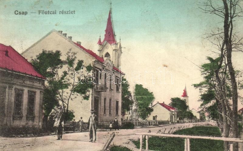 Beschreibung: Csap, Chop; Fő utca, Református templom. Csapvidéki Fogyasztási Szövetkezet kiadása / main street, Calvinist church (EK)