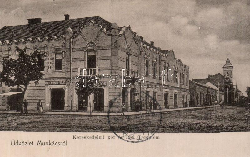 Munkács, Mukacheve, Mukacevo; Kereskedelmi kör, Református templom, Hausman H. és veje, Berger Herman üzlete. Pannonia kiadása / trade association, Calvinist church, shops (fa)