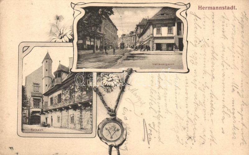 Beschreibung: 1906 Nagyszeben, Hermannstadt, Sibiu; Városháza, Disznódi utca, Julus Wermescher üzlete / Heltauergasse, Rathaus / street, town hall, shop. Art Nouveau (EK)