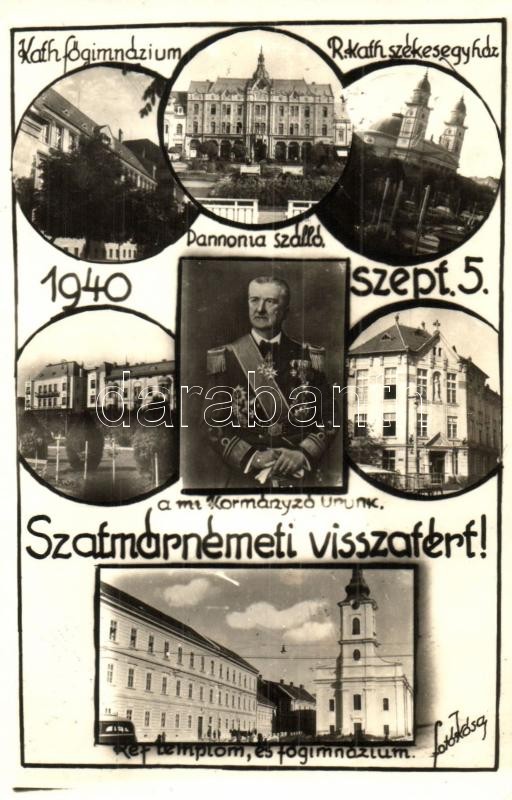 1940 Szatmárnémeti, Satu Mare; Horthy Miklós, Katolikus főgimnázium és székesegyház, Pannonia szálló, református templom és főgimnázium. Foto Kósa / grammar school, cathedral, hotel "1940 Szatmárnémeti visszatért" So. Stpl