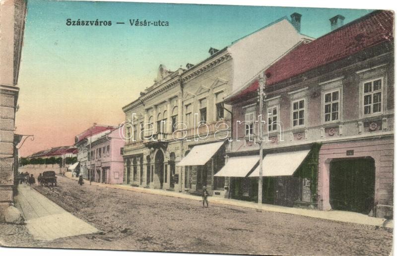 Beschreibung: Szászváros, Broos, Orastie; Vásár utca, üzlet. Kiadja Weisz Dezső / Market street, shops (Rb)