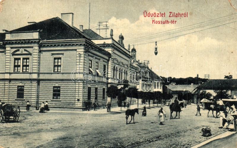 Zilah, Zalau; Kossuth tér, Vigadó kávéház és étterem, piaci árusok. W. L. Bp. 2320. Kiadja a Szövetség könyvnyomda / square, café and restaurant, market vendors (EB)
