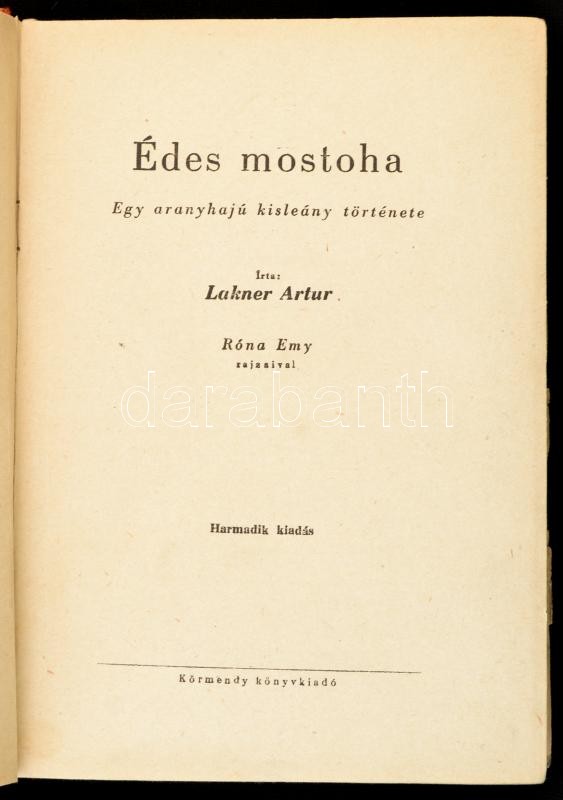 Lakner Artur: Édes Mostoha. Egy aranyhajú kislány története. Róna Emy ... https://www.darabanth.com/de/333-Fernauktion/333.0/Bucher/Bucher-Andere-kuriositaten~1500019/Lakner-Artur-Edes-Mostoha-Egy-aranyhaju-kislany-tortenete-Rona-Emy-rajzaival-Bp-Kormend~II1864022