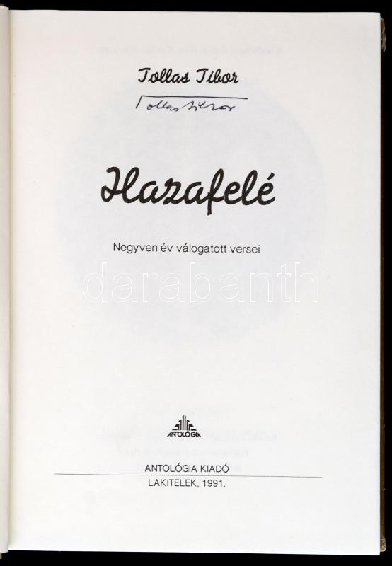 Tollas Tibor: Hazafelé. Negyven év válogatott versei. A szerző ALÁÍRÁSÁVAL! Lakitelek, 1991, Antológia Kiadó. Kiadói egészvászon kötés, sérült papír védőborítóval, egyébként jó állapotban.