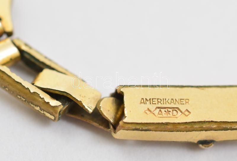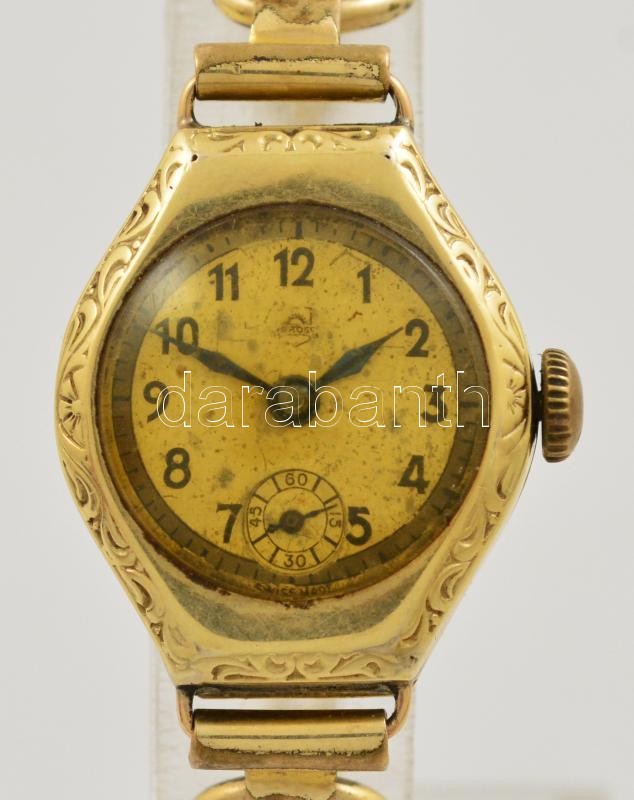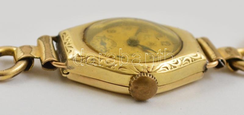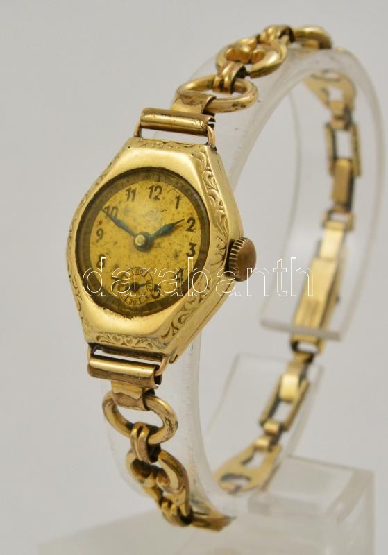 Beschreibung: Svájci mechanikus női karóra, 14 K arany (Au) óratokkal, 16 köves, sárga színű, másodpercmutatós számlappal, fém szíjjal, bruttó: 16.7 g.