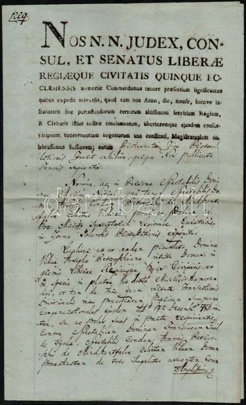 Beschreibung: 1817 Pécs, mindszenti Petrovszky-család birtokügyében íródott okirat, Pécs Város szárazpecsétjével, aláírással, latin nyelven, vízjeles papíron, 2 sztl. lev.