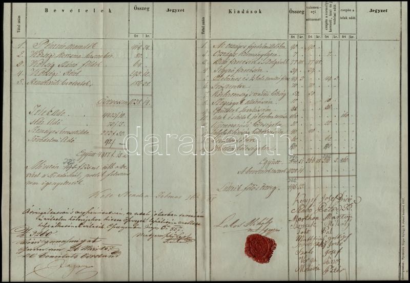 Beschreibung: 1857 Szend község költségvetése, pecsételve, a községi elöljárók által aláírva, felülvizsgálati megjegyzésekkel, szép állapotban