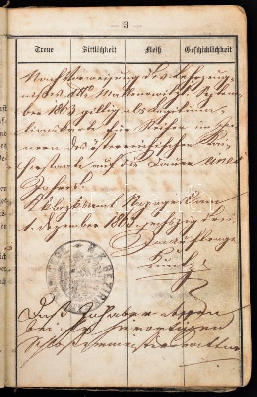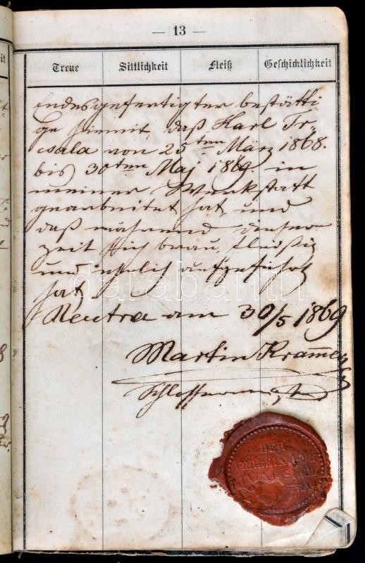 1870 Kulcskészítő munkakönyve, több pecsétes bejegyzéssel https://www.darabanth.com/de/333-Fernauktion/333.0/Kunst-Dokumente-andere-Sammelgebiete/Dokument~500019/1870-Kulcskeszito-munkakonyve-tobb-pecsetes-bejegyzessel~II1864338
