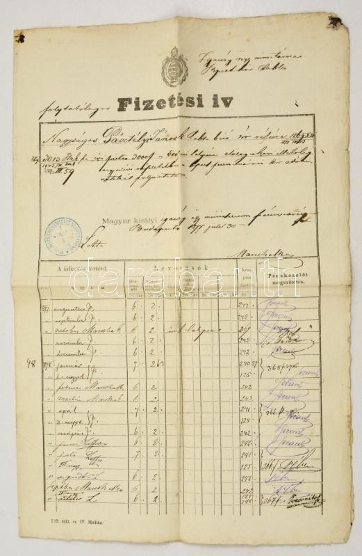 Beschreibung: 1879 Budapest, igazságügyi minisztériumi fizetési ív bíró részére