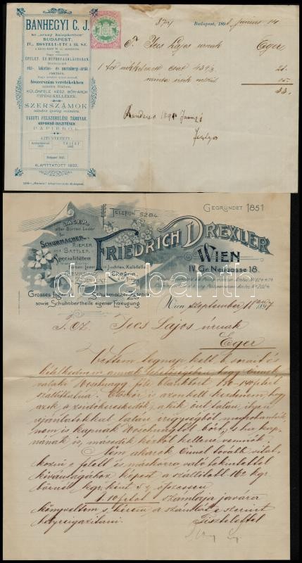 1897-1898 Eger, Bánhegyi C.J. fejléces számlája, benyomott 1 kr. számlabélyeggel,Wien, Friedrich Drexler cég levele, fejléces papíron, kis szakadással.