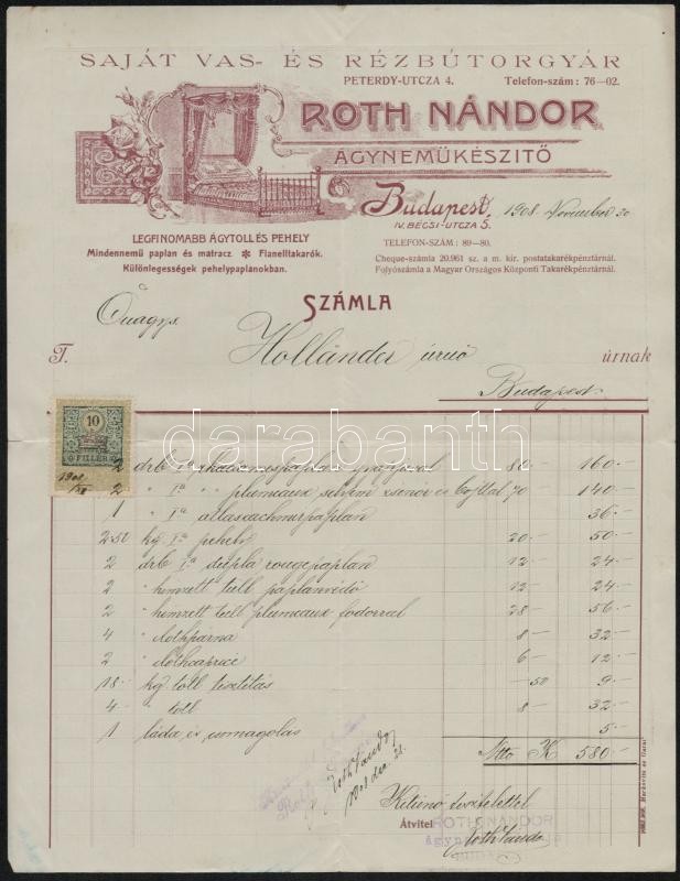 1908 Bp., Roth Nándor ágyneműkészítő fejléces számlája, 10 f. okmánybé... https://www.darabanth.com/de/333-Fernauktion/333.0/Kunst-Dokumente-andere-Sammelgebiete/Dokument~500019/1908-Bp-Roth-Nandor-agynemukeszito-fejleces-szamlaja-10-f-okmanybelyeggel~II1869821