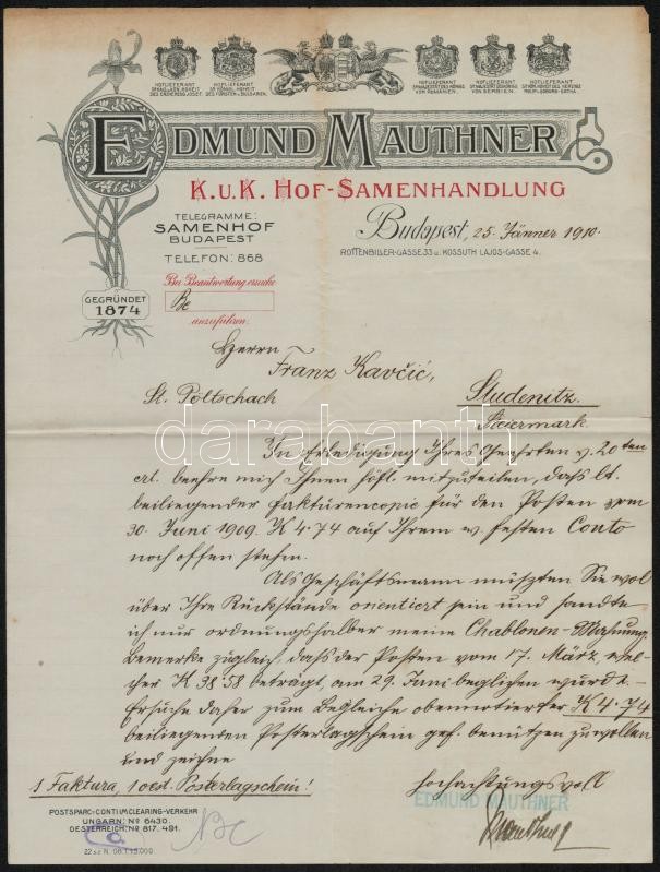 1910 Bp., Edmund Mauthner vetőmagkereskedésének fejléces levele, kézze... https://www.darabanth.com/de/333-Fernauktion/333.0/Kunst-Dokumente-andere-Sammelgebiete/Dokument~500019/1910-Bp-Edmund-Mauthner-vetomagkereskedesenek-fejleces-levele-kezzel-irt-nemet-nyelvu-uz~II1869809