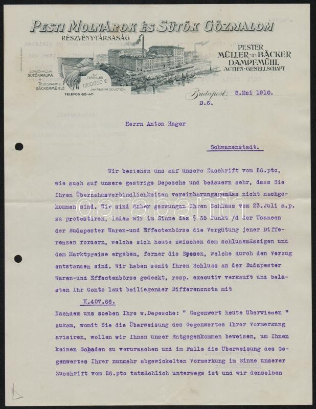 1910 Bp., Pesti Molnárok és Sütők Gőzmalom Rt. fejléces levele, gépelt... https://www.darabanth.com/de/333-Fernauktion/333.0/Kunst-Dokumente-andere-Sammelgebiete/Dokument~500019/1910-Bp-Pesti-Molnarok-es-Sutok-Gozmalom-Rt-fejleces-levele-gepelt-nemet-nyelvu-uzlet~II1869779