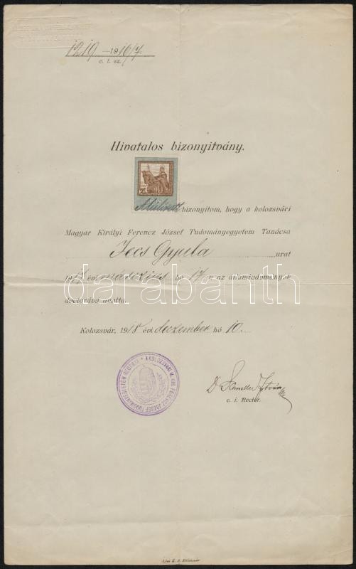 1918 Kolozsvári M. Kir. Ferenc József Tudományegyetem államtudományi doktorrá avatási bizonyítványa, pecséttel, Schneller István (1847-1939) rektor aláírásával, 2 k. okmánybélyeggel