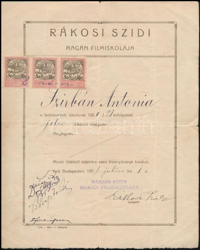 1921 Rákosi Szidi magán filmiskolája bizonyítványa, aláírásokkal, okmá... https://www.darabanth.com/de/333-Fernauktion/333.0/Kunst-Dokumente-andere-Sammelgebiete/Dokument~500019/1921-Rakosi-Szidi-magan-filmiskolaja-bizonyitvanya-alairasokkal-okmanybelyegekkel~II1866523