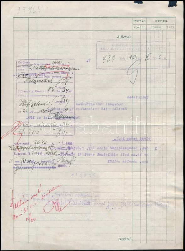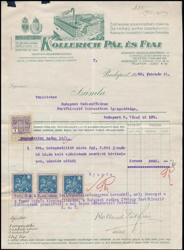 1922 Bp., Kollerich Pál és Fiai Első Magyar Sodronyszövet-, Fonat- és Szitaárú Gyárának fejléces számlája, 1 db 1 kr, 3 db 30 kr okmánybélyeggel, az egyik szélen kis hiánnyal