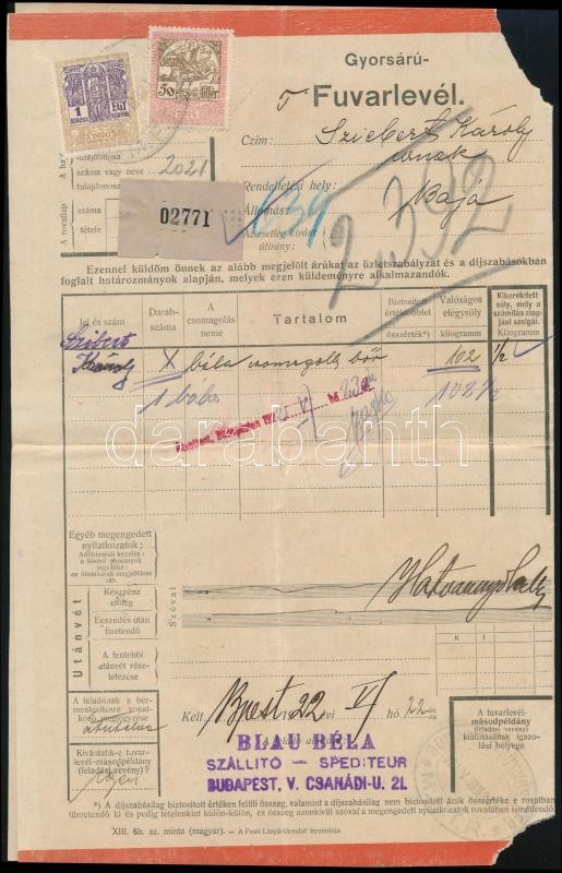 1922 Fuvarlevél Budapest-Baja vonalon, okmánybélyegekkel https://www.darabanth.com/de/333-Fernauktion/333.0/Kunst-Dokumente-andere-Sammelgebiete/Dokument~500019/1922-Fuvarlevel-Budapest-Baja-vonalon-okmanybelyegekkel~II1863127