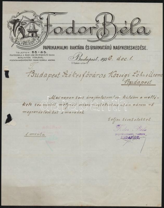 1926 Bp., Fodor Béla paprikamalmi raktára és gyarmatárú kereskedésének... https://www.darabanth.com/de/333-Fernauktion/333.0/Kunst-Dokumente-andere-Sammelgebiete/Dokument~500019/1926-Bp-Fodor-Bela-paprikamalmi-raktara-es-gyarmataru-kereskedesenek-fejleces-szamlaja-~II1869759