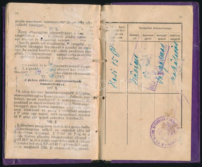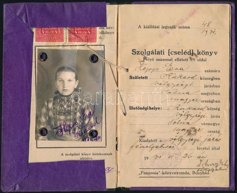 Beschreibung: 1931-1944 Kakasd, fényképes szolgálati cselédkönyv, számos bejegyzéssel, a szekszárdi rendőrkapitányság pecsétjeivel, 2 db 4 f. okmánybélyeggel
