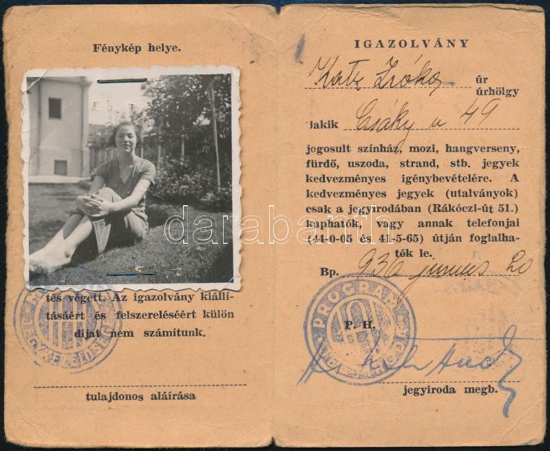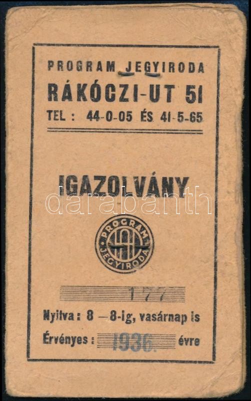 1936 Program jegyiroda fényképes igazolványa https://www.darabanth.com/de/333-Fernauktion/333.0/Kunst-Dokumente-andere-Sammelgebiete/Dokument~500019/1936-Program-jegyiroda-fenykepes-igazolvanya~II1869546