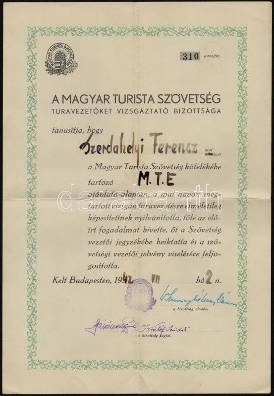 1942 Túravezetői vizsgabizonyítvány, Bp., Magyar Turista Szövetség, al... https://www.darabanth.com/de/333-Fernauktion/333.0/Kunst-Dokumente-andere-Sammelgebiete/Dokument~500019/1942-Turavezetoi-vizsgabizonyitvany-Bp-Magyar-Turista-Szovetseg-alairasokkal-pecsette~II1865090