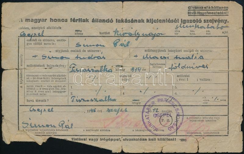 1946 A magyar honos férfiak állandó lakásának kijelentését igazoló sze... https://www.darabanth.com/de/333-Fernauktion/333.0/Kunst-Dokumente-andere-Sammelgebiete/Dokument~500019/1946-A-magyar-honos-ferfiak-allando-lakasanak-kijelenteset-igazolo-szelveny-megviselt-all~II1866914