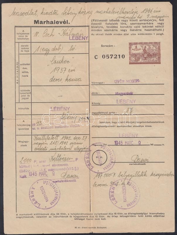 1946 Lébény, marhalevél másodlata https://www.darabanth.com/de/333-Fernauktion/333.0/Kunst-Dokumente-andere-Sammelgebiete/Dokument~500019/1946-Lebeny-marhalevel-masodlata~II1864931
