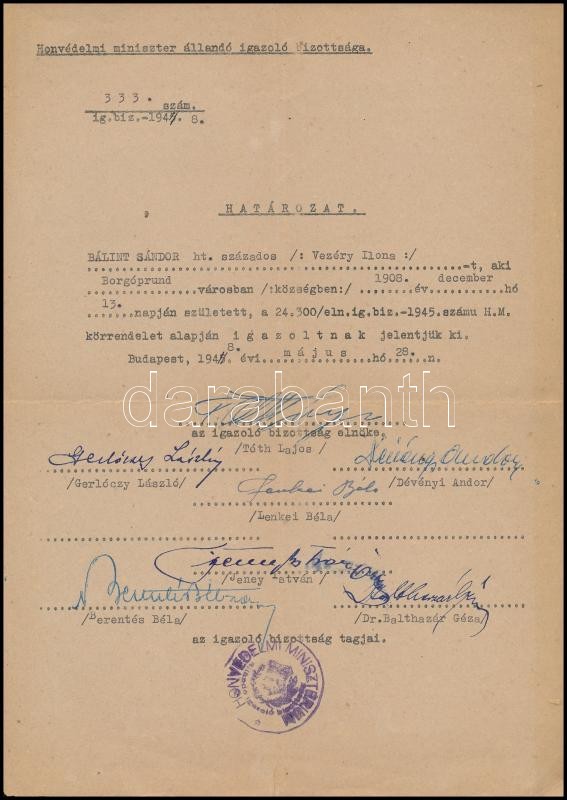 1948 Bp., Honvédelmi miniszter állandó igazoló bizottsága által kiadott határozat, aláírásokkal (Gerlóczy László, Dévényi Andor, Berentés Béla, Balthazár Géza)