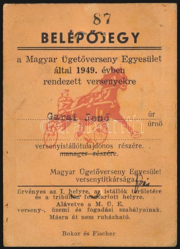 1949 Fényképes ügetőverseny belépőjegy Garai Jenő versenyistálló tulaj... https://www.darabanth.com/de/333-Fernauktion/333.0/Kunst-Dokumente-andere-Sammelgebiete/Dokument~500019/1949-Fenykepes-ugetoverseny-belepojegy-Garai-Jeno-versenyistallo-tulajdonos-Alag-reszer~II1869302