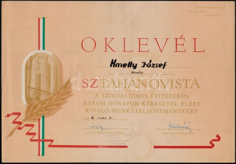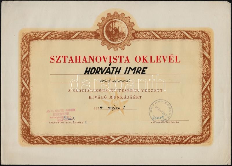 1956 2 db sztahanovista oklevél https://www.darabanth.com/de/333-Fernauktion/333.0/Kunst-Dokumente-andere-Sammelgebiete/Dokument~500019/1956-2-db-sztahanovista-oklevel~II1868596