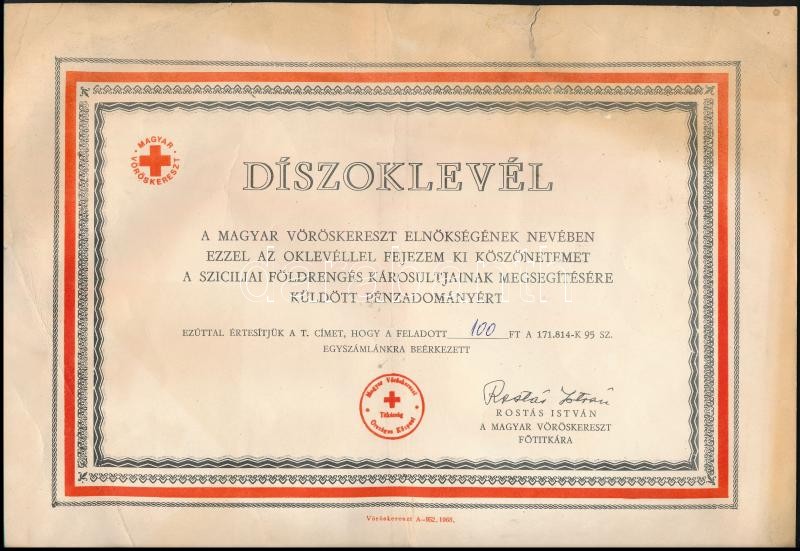 1968 a Magyar Vöröskereszt díszoklevele a szicíliai földrengés károsul... https://www.darabanth.com/de/333-Fernauktion/333.0/Kunst-Dokumente-andere-Sammelgebiete/Dokument~500019/1968-a-Magyar-Voroskereszt-diszoklevele-a-sziciliai-foldrenges-karosultjain-valo-segitsegC3~II1866528