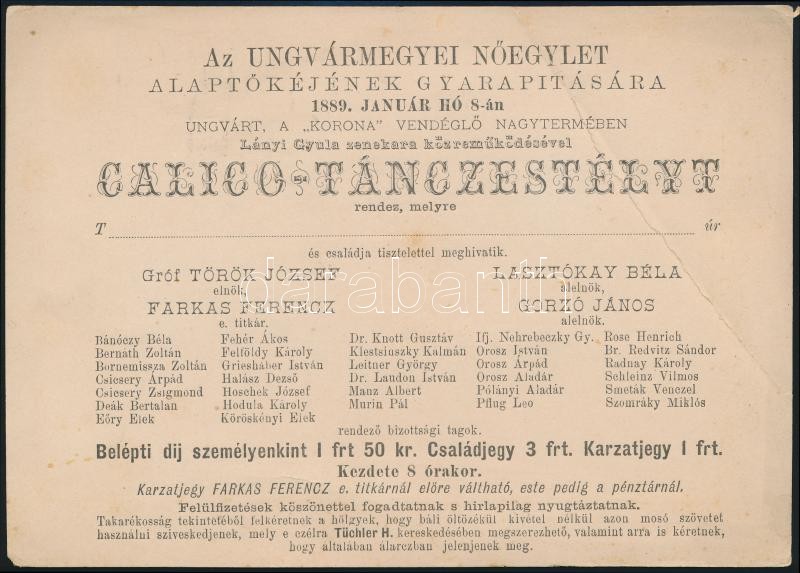 1889 Az Ungvármegyei Nőegylet meghívója Calico táncestélyre. Törésnyom... https://www.darabanth.com/de/333-Fernauktion/333.0/Kunst-Dokumente-andere-Sammelgebiete/Drucksachen~500034/1889-Az-Ungvarmegyei-Noegylet-meghivoja-Calico-tancestelyre-Toresnyommal-18x13-cm~II1861876